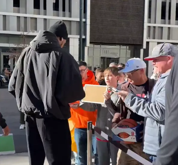 赛前,火箭社媒分享凯文-杜兰特为球馆外的球迷亲切签名的瞬间。